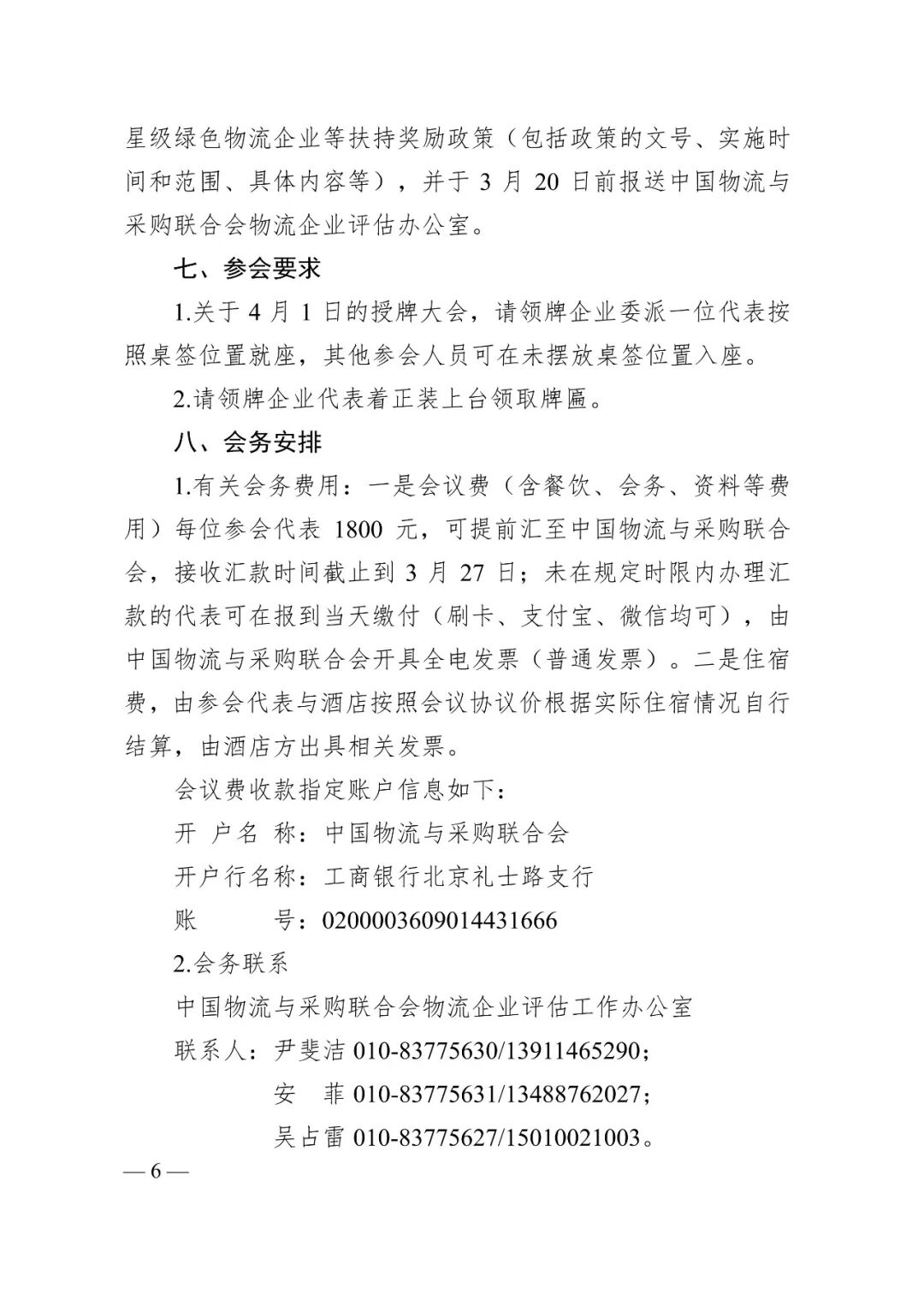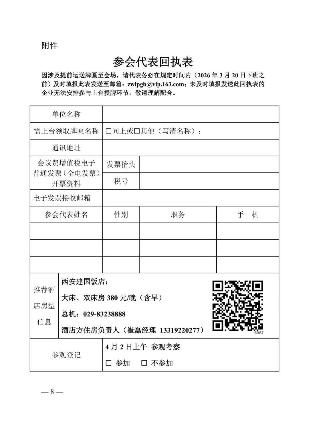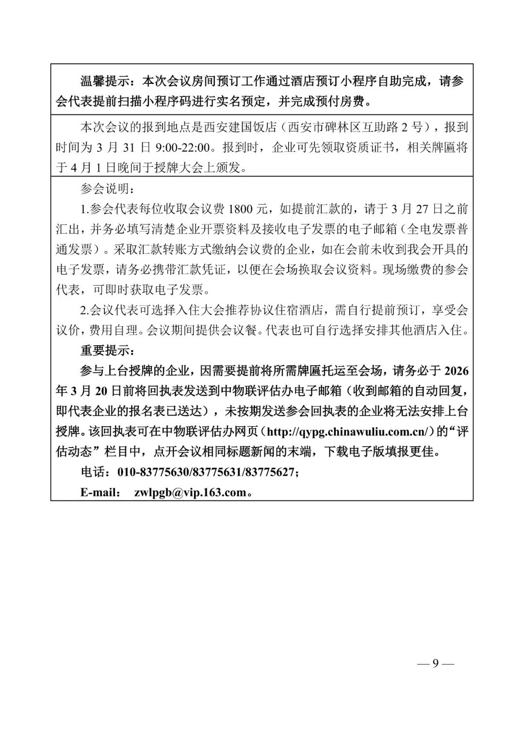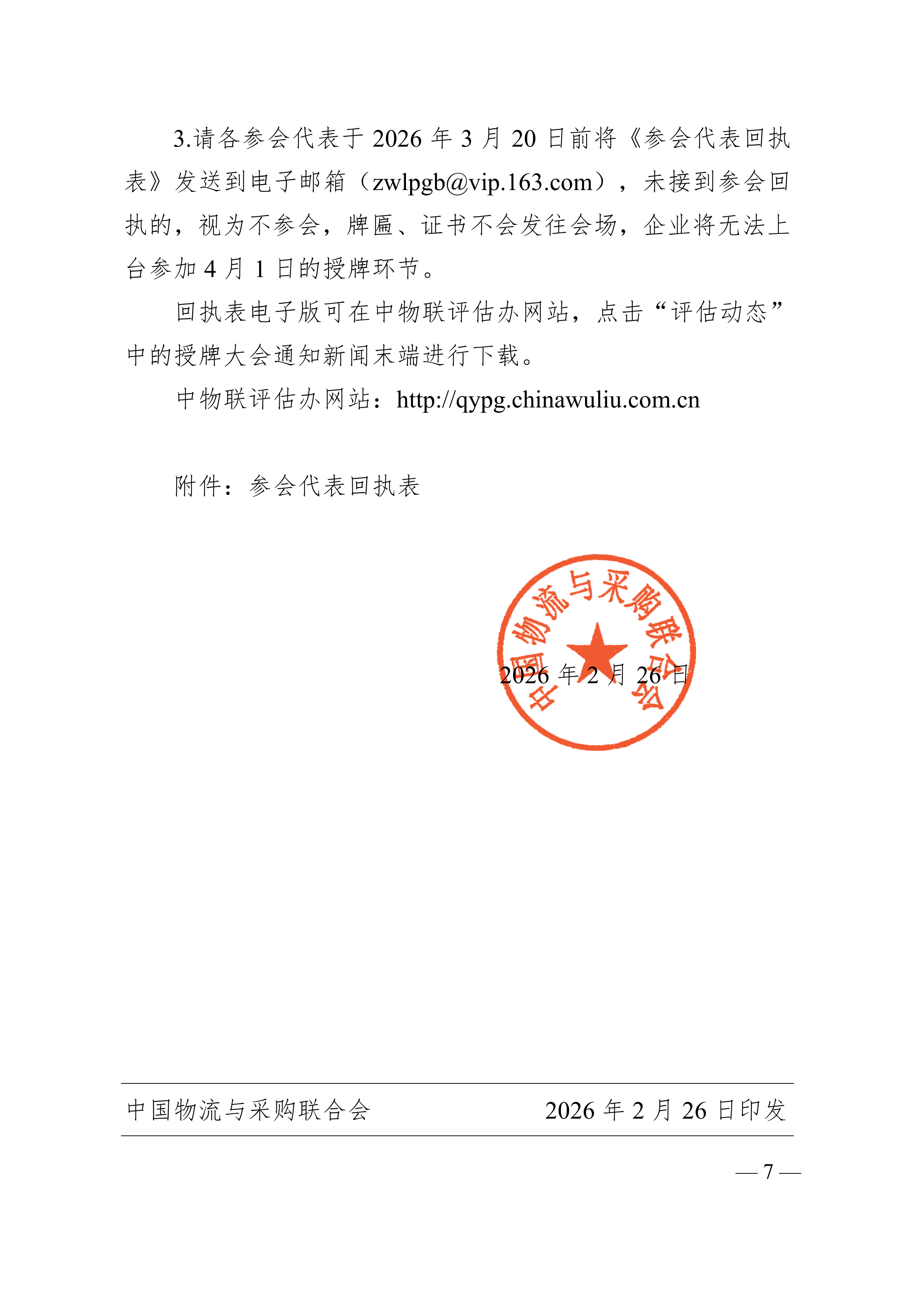 请参会代表于3月20日前将《参会代表回执表》发送到会务组邮箱(zwlpgb@vip.163.com)并抄送省现代物流协会(22854717@qq.com),未按照要求发送参会回执表的企业将无法安排上台授牌。会议详细事项见附件。