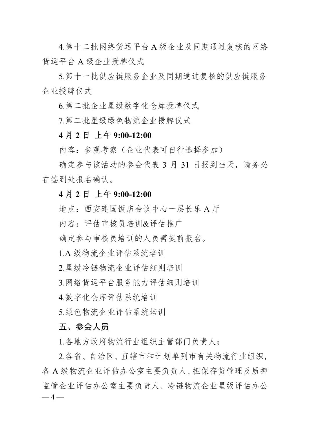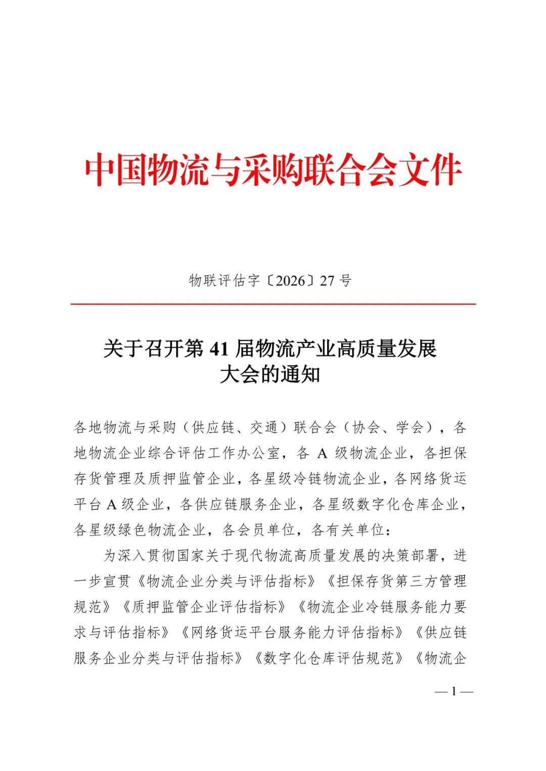 为深入贯彻国家关于现代物流高质量发展的决策部署,进一步宣贯物流企业分类评估系列国家(行业、团体)标准,发挥优秀企业示范引领作用,搭建行业交流合作平台,中国物流与采购联合会决定于2026年3月31日-4月2日在西安市举办“第41届物流产业高质量发展大会”,同期开展第四十一批物流企业授牌活动。请通过第41批评估和复核的A级物流企业、星级冷链、星级数字化仓库等企业安排人员参会,也欢迎其他物流相关企业参会。