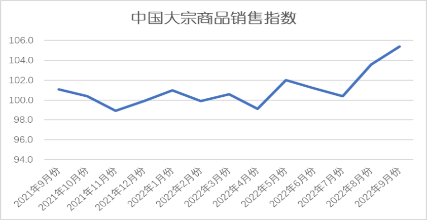 2022年9月份,大宗商品销售指数较上月上升1.8个百分点,至105.4%,指数升至2021年5月份以来的最高点,显示随着传统旺季来临,终端用户备货积极,市场销售情况向好,企业订单组织逐步顺畅,本月国内大宗商品销售量增速较上月有所加快。各主要商品中,本月各商品销售量继续呈现全部上升的局面,且增速均有所加快。