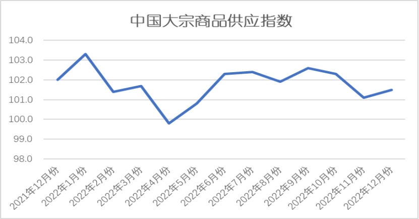 由中国物流与采购联合会调查、发布的2022年12月份中国大宗商品指数(CBMI)为101.0%,较上月回升0.8个百分点,指数止跌回升。各分项指数中,供应指数、销售指数和库存指数均有所回升,但从数据情况来看,本月销售量仍呈现下降态势,仅是降幅有所收窄。从指数的变化情况来看,本月指数回升主要是受代表供应端的供应指数和库存指数上升拉动所致,而销售指数反弹动力明显不足,显示当前国内大宗商品市场供强需弱的格局再度形成,市场情绪正在向悲观转化。进入2023年1月份,随着春节的临近,后期需求强度还会进一步下降,特别是中旬以后,终端需求将会降至冰点,目前地产数据依然乏力,多项数据跌幅扩大,政策效果还需要时间来实现。我们预计市场供需矛盾将会进一步加大,市场下行压力将会明显加大。春节假期过后,随着需求端逐步回升,大宗商品价格也有望走强,同时美联储加息进程已经减缓,有望在2023年进入宽松的货币周期,对于大宗商品整体价格有一定程度支撑,我们预计2023年国内大宗商品市场运行情况整体好于2022年,商品价格水平也会高于2022年。