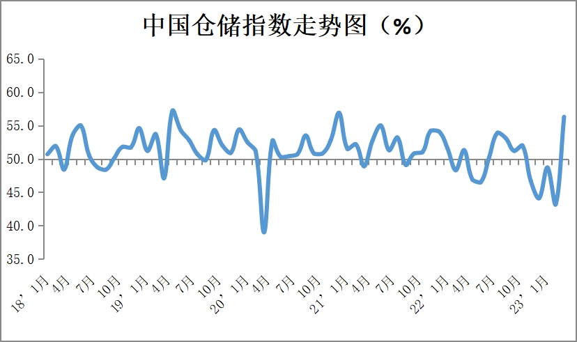 中国物流与采购联合会发布的2023年2月份中国物流业景气指数为50.1%,较上月回升5.4个百分点;中国仓储业指数为56.3%,较上月回升13.1个百分点。