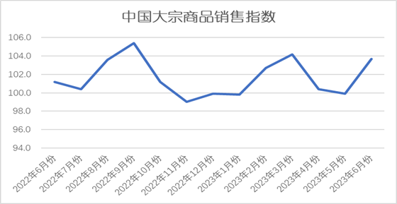 2023年6月份,大宗商品销售指数止跌反弹,当月较上月回升3.8个百分点,至103.7%,显示下游行业复苏迹象明显,市场订货积极性高涨,企业订单组织顺畅。不过,值得注意的是,本月指数明显回升,是建立在前期基数较低的基础上,实际上需求回升仍较为温和,特别是6月下旬以来,受高温多雨天气影响,需求淡季效应显现,市场情绪再度趋于谨慎。从各主要商品的情况来看,本月各商品销售量较上月均有增加,其中,钢铁、铁矿石和煤炭销售量止跌回升,有色金属、化工和汽车销售量继续增加,且增速加快,成品油销售量虽连续七个月增加,但本月受柴油需求下滑以及基数较高的影响,销售增速略有减缓。