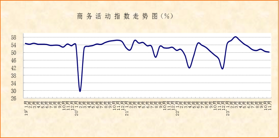 中国物流与采购联合会、国家统计局服务业调查中心发布的2023年11月份中国非制造业商务活动指数为50.2%,较上月下降0.4个百分点,连续2个月环比下降,降幅较上月有所收窄,显示非制造业经营活动仍保持增长趋势,但增速继续小幅放缓。细分指数变化显示,市场需求较上月有所恢复,恢复力度仍有待提升;房屋建筑业活动较上月上升,保交楼活动有所升温;年底企业资金需求趋升,金融支持实体经济力度相应显现;业务活动预期指数创下半年新高,企业预期普遍乐观。