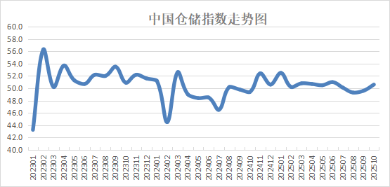 中国物流与采购联合会和中储发展股份有限公司联合调查的中国仓储指数,2025年10月份为50.6%,较上月回升1个百分点,重回50%以上的扩张区间,业务量增加,设施利用率提高,周转效率加快,库存降幅收窄,行业活跃度有所提升,企业补库意愿略有增强,对后市的预期稳中向好。具体来看,本月指数呈现以下特征: