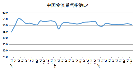 中国物流与采购联合会发布的2025年10月份中国物流业景气指数为50.7%,较上月回落0.5个百分点。
