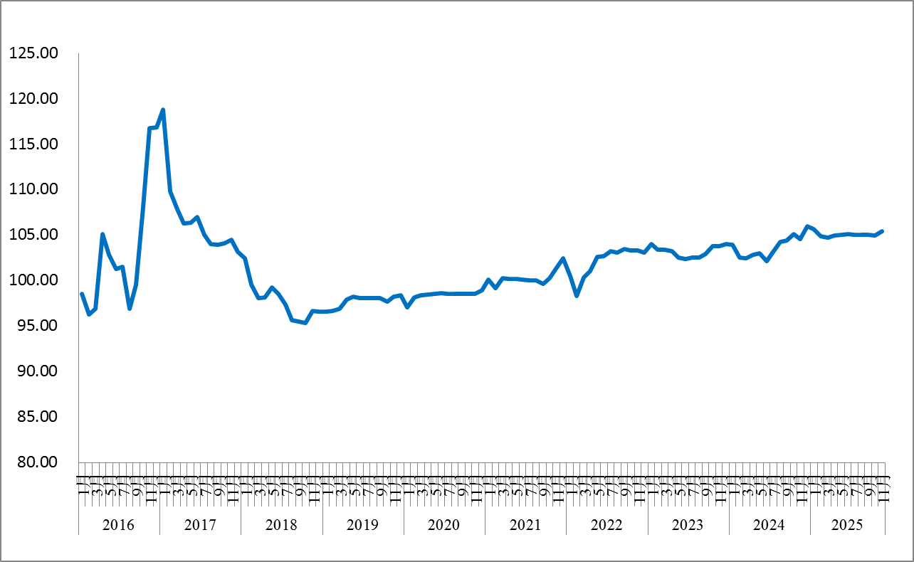 2025年11月份,由中国物流与采购联合会和林安物流集团联合调查的中国公路物流运价指数为105.4点,环比回升0.46%,同比去年回升0.82%。从月内看,本月各周运价指数环比均有所回升。