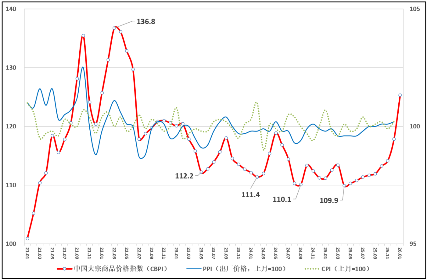 由中物联大宗商品流通分会和上海钢联等单位联合调查,中国物流与采购联合会发布的2026年1月份中国大宗商品价格指数(CBPI)为125.3点,环比上涨6.3%,同比上涨12.7%,创2022年7月以来新高。从指数运行情况来看,一方面,随“两重”“两新”政策加力扩围,“反内卷”政策不断深化,企业预期保持乐观,生产活动延续扩张态势,为“十五五”开局奠定良好基础;另一方面,国际地缘政治深刻演变、货币政策宽松预期、以及大宗商品期货价格剧烈波动,带动国内有色、化工等价格快速上涨,亦带来多重挑战。当前国际金融市场动荡明显加大,部分大宗商品上涨过快,需高度重视并加强外部输入性风险研判,加大宏观政策调节力度,维护产业链供应链稳定。