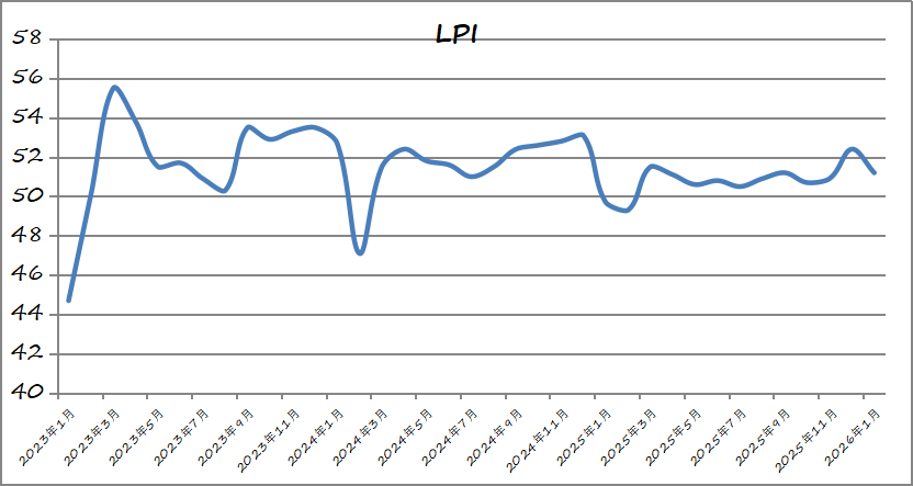 中国物流与采购联合会发布的2026年1月份中国物流业景气指数为51.2%,较上月回落1.2个百分点。本月物流业务活跃度有所放缓,但仍保持扩张态势,其中业务总量指数、新订单指数、物流服务价格指数、固定资产投资完成额指数、从业人员指数和业务活动预期指数在50%以上扩张区间。